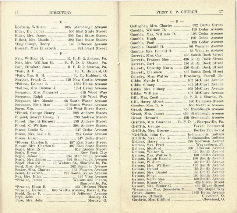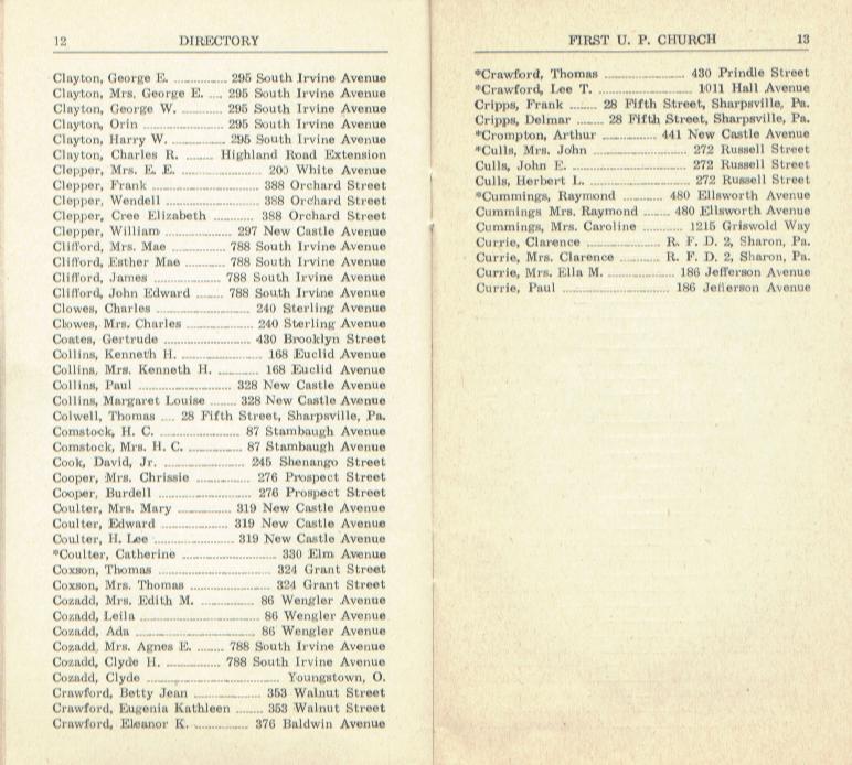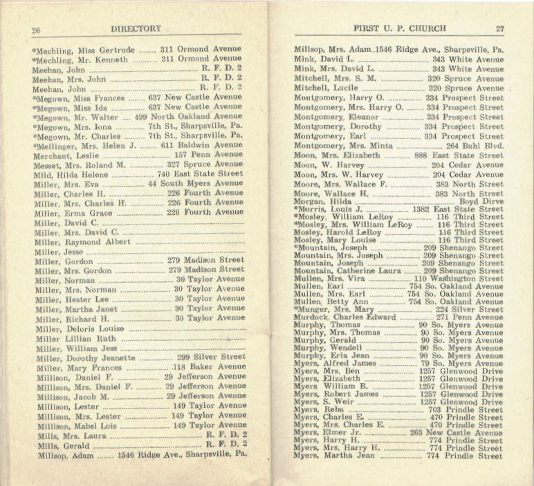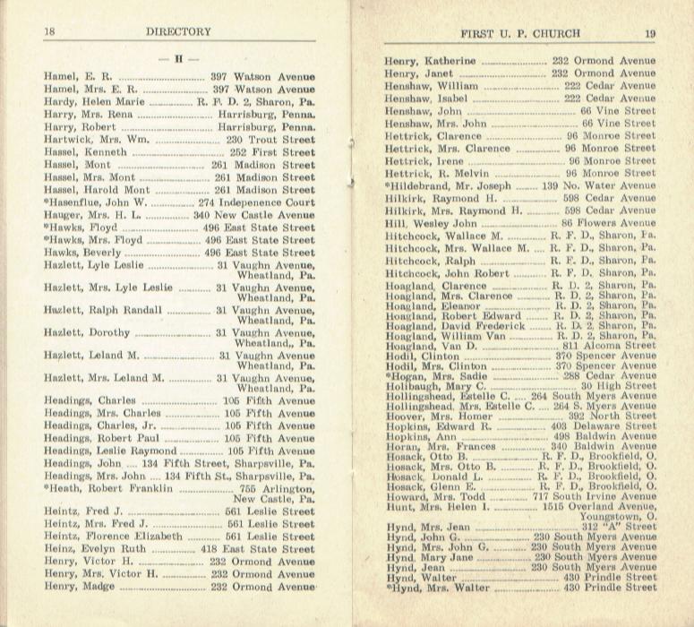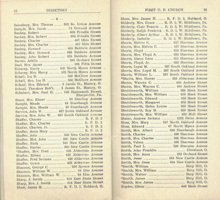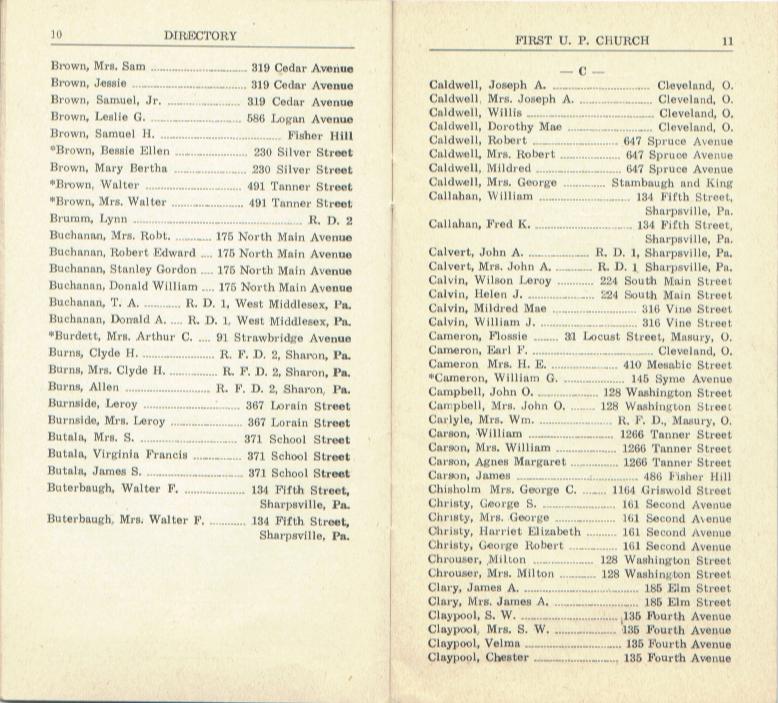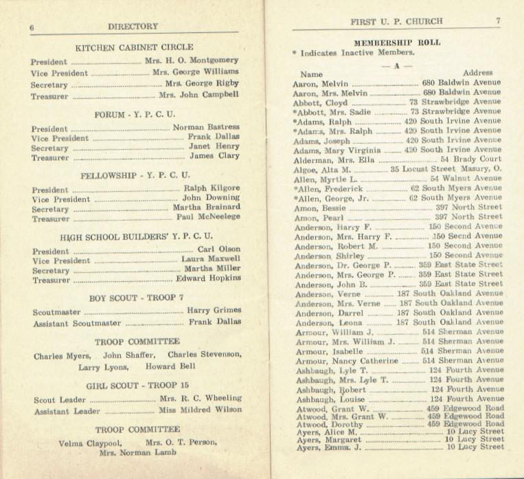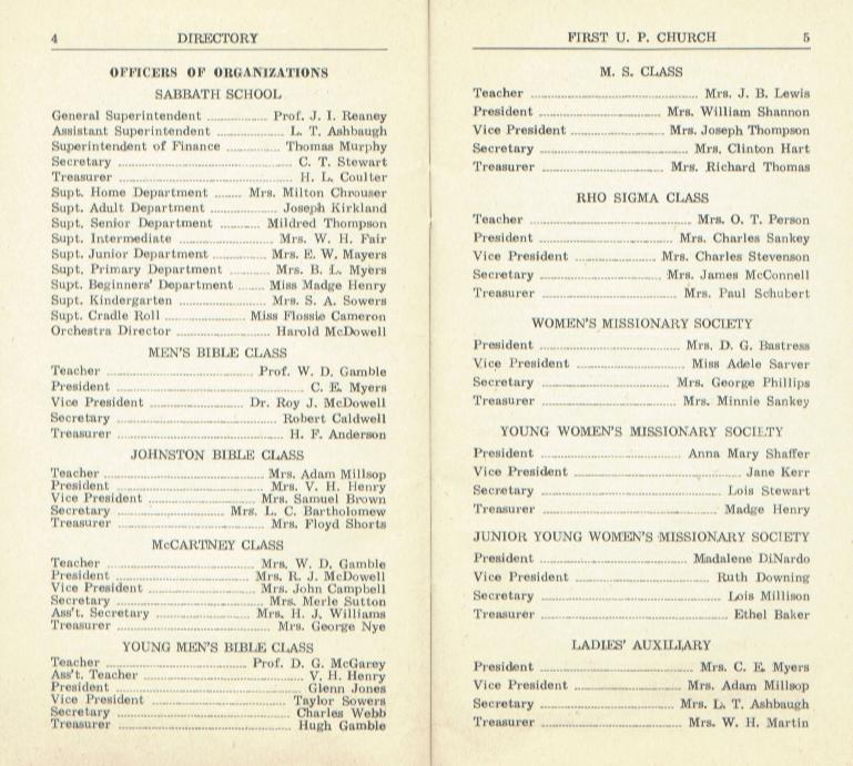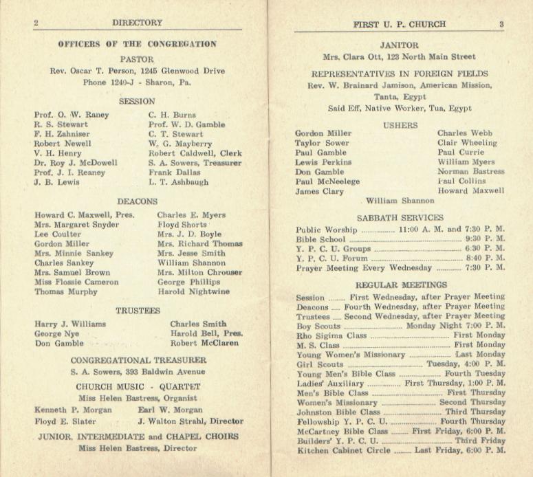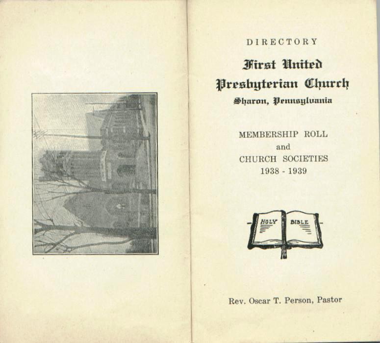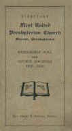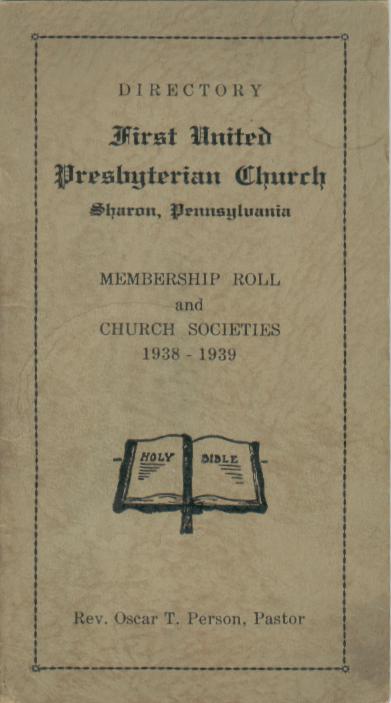 title page to the booklet First United Presbyterian Church, Sharon, PA Officers of the Congregation Session, Deacon, Trustees, Janitor, Ushers, Regular Meetings Officers of Organizations Sabbath School, Bible Class, Women's Missionary Society, Ladies' Auxiliary Officers of Organizations Kitchen Cabinet Circle, Y.P.C.U., Boy Scout Troup 7, Girls Scout Troup 15 |