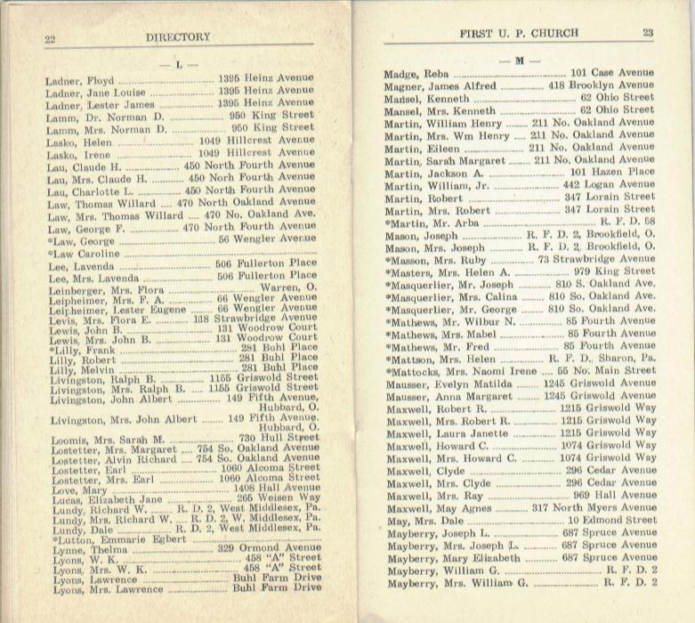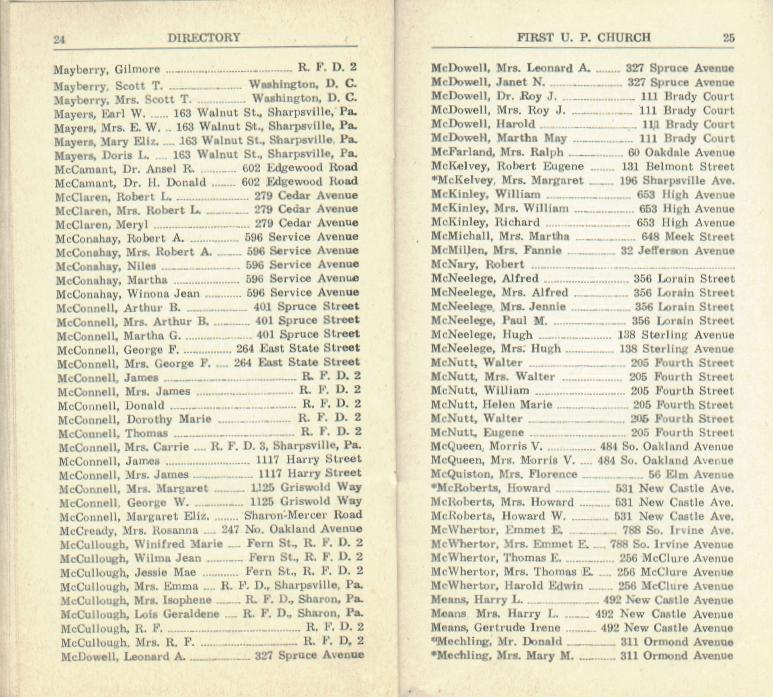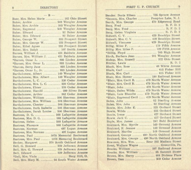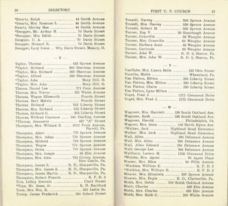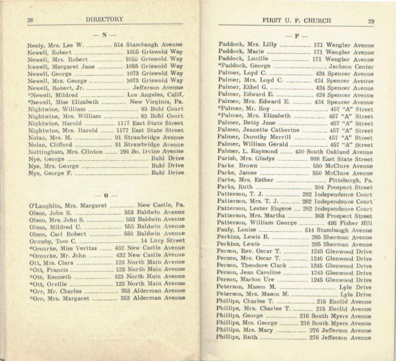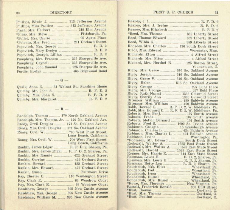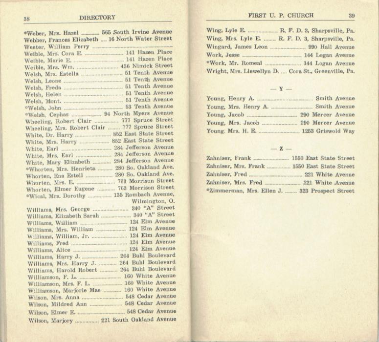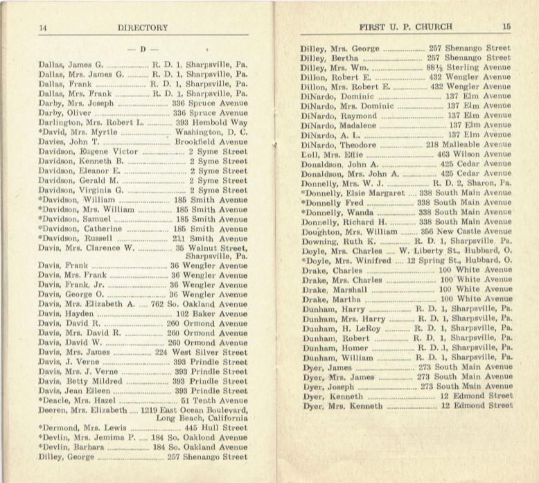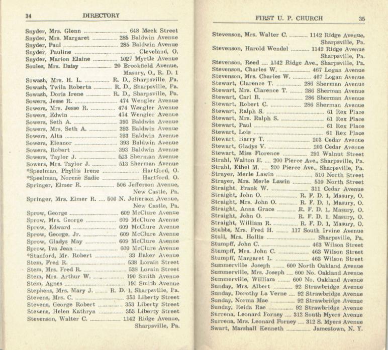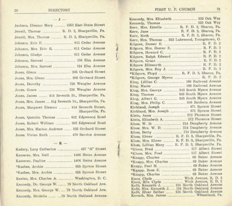 title page to the booklet First United Presbyterian Church, Sharon, PA Officers of the Congregation Session, Deacon, Trustees, Janitor, Ushers, Regular Meetings Officers of Organizations Sabbath School, Bible Class, Women's Missionary Society, Ladies' Auxiliary Officers of Organizations Kitchen Cabinet Circle, Y.P.C.U., Boy Scout Troup 7, Girls Scout Troup 15 |