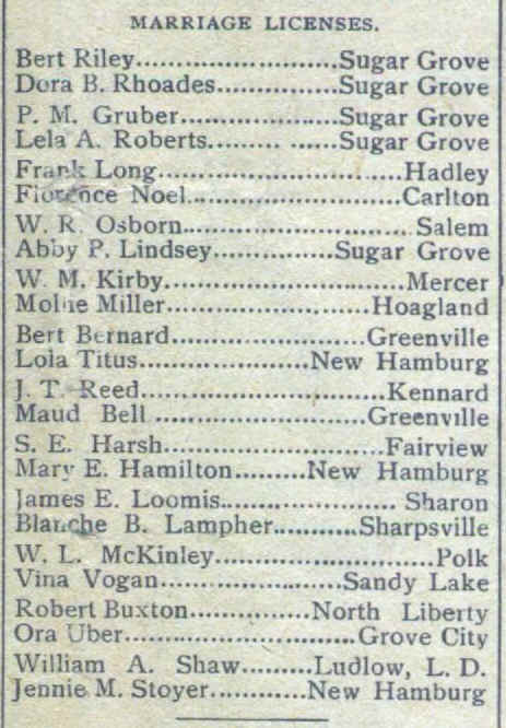 Bert Riley Dora B. Rhoades | Sugar Grove Sugar Grove | P. M. Gruber Lela A. Roberts | Sugar Grove Sugar Grove | Frank Long Florence Noel | Hadley Carlton | W. R. Osborn Abby P. Lindsey | Salem Sugar Grove | W. M. Kirby Mollie Miller | Mercer Hoagland | Bert Bernard Lola Titus | Greenville New Hamburg | J. T. Reed Maude Bell | Kennard Greenville | S. E. Harsh Mary E. Hamilton | Fairview New Hamburg | James E. Loomis Blanche B. Lampher | Sharon Sharpsville | W. L. McKinley Vina Vogan | Polk Sandy Lake | Robert Buxton Ora Uber | North Liberty Grove City | William A. Shaw Jennie M. Stoyer | Ludlow, L. D. New Hamburg |