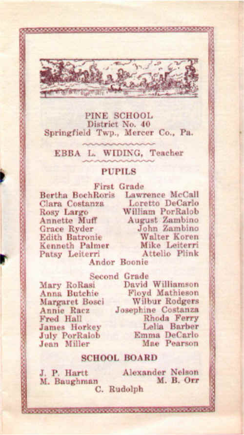Pine School Students in 1927 Ebba L. Widing, Teacher | FIRST GRADE Bertha BochRoris Clara Costanza Rosy Largo Annette Muff Grace Ryder Edith Batronie Kenneth Palmer Patsy Lieterri Lawrence McCall Loretto DeCarlo William PorRalob August Zambino John Zambino Walter Koren Mike Leiterri Attellio Plink Ander Boonie | SECOND GRADE Mary RoRasi Anna Butchie Margaret Bosci Anni Racz Fred Hall James Horkey July PorRalob Jean Miller David Williamson Floyd Mathieson Wilbur Rodgers Josephine Costanza Rhoda ferry Lelia Barber Emma DeCarlo Mae Peterson | SCHOOL BOARD J. P. Hartt M. Baughman Alexander Nelson M. B. Orr C. Rudolph |